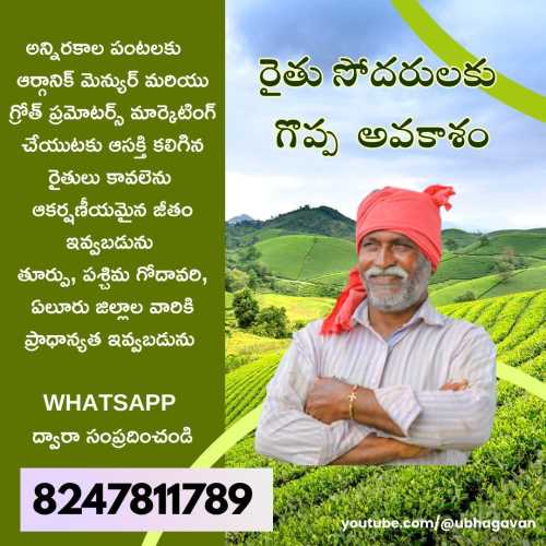 ఆసక్తి కల రైతులు మరియు agriculture products marketing చేస్తున్న ఎవరైనా సరే ఈ అవకాశం వినియోగించుకోవచ్చు. మరిన్ని పూర్తి సమాచారం కోసం 8247811789 నంబర్ లో WhatsApp ద్వారా సంప్రదించండి.