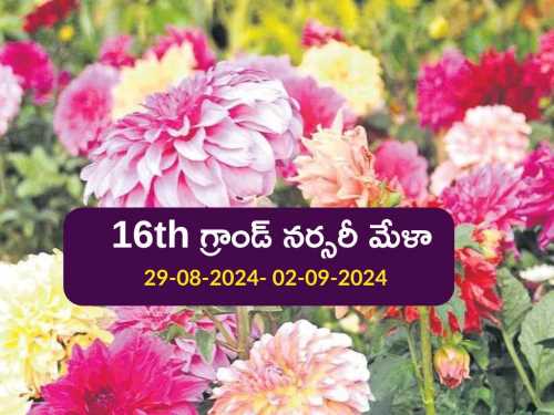 హైదరాబాద్ నెక్లెస్ రోడ్ పీపుల్స్ ప్లాజా ప్రాంగణంలో గ్రాండ్ నర్సరీ మేళా - 2024 ఆగస్ట్ 29 నుండి సెప్టెంబర్ 2 వరకు 16th గ్రాండ్ నర్సరీ మేళా జరగనుంది. ఈ అఖిల భారత వ్యవసాయ, ఉద్యాన ప్రదర్శనను అగ్రికల్చర్ మినిస్టర్ ఆగస్ట్ 29 ఇనాగురేట్ చేయనున్నారు. ఈ నర్సరీ మేళా అయిదు రోజుల పాటు కొనసాగనుంది. దీనిలో వివిధ రకాల విత్తన, ఎరువులు, రకరకాల పూల, సుగంధ, ఔషధ మొక్కలను మరియు వ్యవసాయ, ఉద్యాన, ఆర్గానిక్ సంబందిత రకరకాల ఉత్పత్తులను చూడవచ్చు.