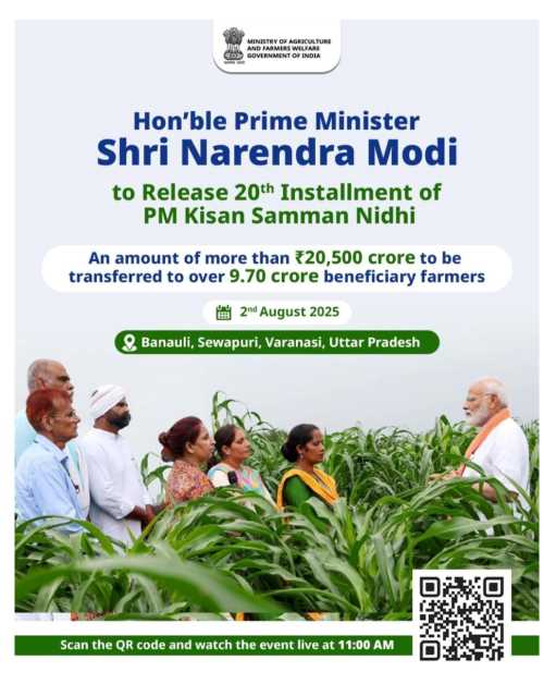 ఉత్తరప్రదేశ్లోని వారణాసిలో జరిగే కార్యక్రమంలో ప్రధానమంత్రి రైతులకు పెట్టుబడి సాయం కింద కేంద్ర ప్రభుత్వం అందజేస్తున్న ప్రధానమంత్రి కిసాన్ సమ్మాన్ నిధి 20వ విడత నిధులు శనివారం రిలీజ్ చేయనున్నారు.దేశ వ్యాప్తంగా 9.7 కోట్ల మంది రైతులకుగాను రూ. 20,500 కోట్లు జమ అవనున్నాయి. ఈ ప్రోగ్రాంలో కేంద్ర వ్యవసాయం మంత్రి శివరాజ్ సింగ్ చౌహాన్ పాల్గొననున్నారు. ఈ స్కీమ్ ద్వారా ప్రతి ఏటా కేంద్ర ప్రభుత్వం మూడు విడతలుగా రూ.6,000 ఆర్థిక సాయాన్ని(రూ.2,000 చొప్పున) అందజేసేది అందరికీ తెలిసిందే.